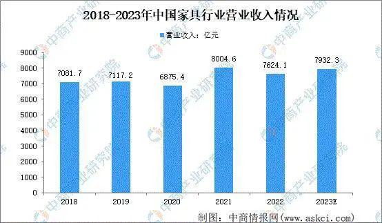數據顯示,2022年受疫情和外貿等因素影響,我國家具行業規模以上企業實現營業務收入7624.1億元,同比下降-4.8%。回顧2018-2022年家具制造業營業收入情況:近年來,我國家具制造業營業收入總體呈小幅度下降趨勢,預計2023年我國家具行業復蘇營業收入將達7932.3億元。