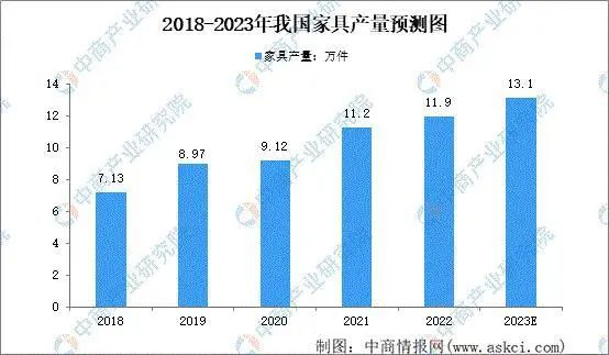 作為全球家具生產中心,早在2006年中國家具產業產值已躍居世界第一位,中國已然成為世界家具生產、消費及出口大國。2022年我國家具業產量11.9萬件,同比增長5.9%。預計2023年我國家具行業產量將達13.1萬件,同比增長10.05%。