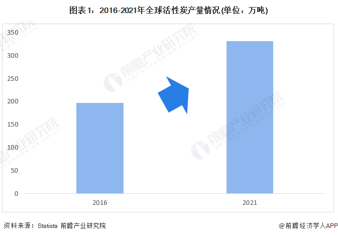隨著全球活性炭技術的不斷發展,活性炭行業產能迅速增加。公眾對健康問題的重視,助推活性炭產能逐年遞增。Statista數據顯示,全球活性炭總產量已從2016年的196.2萬噸,增長到2021年的331.1萬噸。