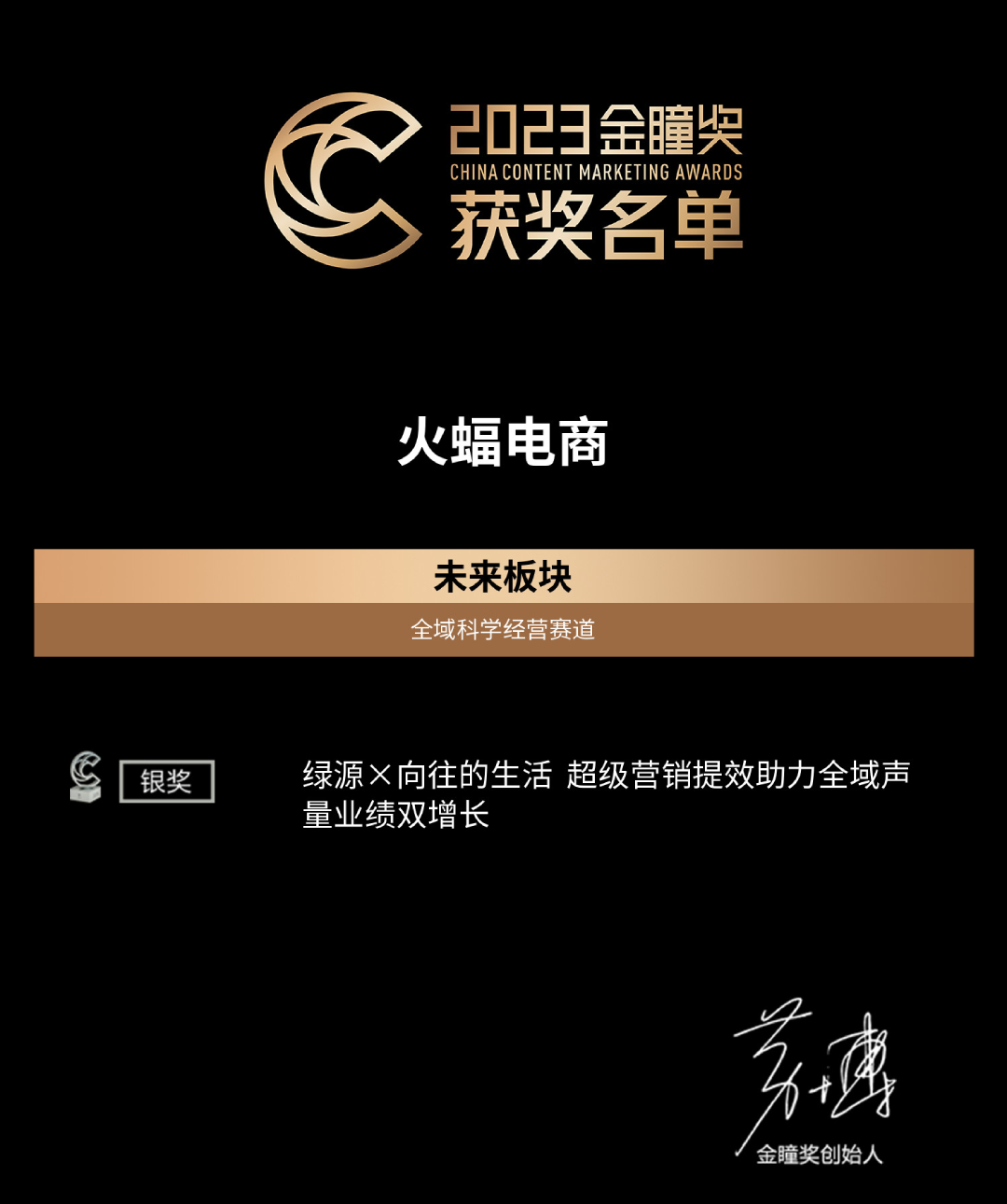 據了解,金瞳獎(2011——至今)是由中國商務廣告協會(CAAC)指導,傳播行業平臺“廣告門”主辦,對內容及內容營銷領域進行商業價值認定的權威獎項。本屆金瞳獎共設置「原創內容」、「內容營銷」、「未來板塊」三大獎項單元,讓更多符合時代需要、引領行業發展的好內容、好作品有機會被行業看見、了解和學習。評審團匯集了來自代理公司、頭部互聯網營銷平臺及品牌方在內的140余位行業影響力人物,對1211件入圍作品進行激烈討論和評選。火蝠電商憑借創意力與洞察力榮獲2023金瞳獎【最具數智經營力品牌——銀獎】榮譽,并攜手品牌方—綠源電動車,從策略到執行達成“品效合一”,為品牌、行業與社會貢獻一場經典的營銷視聽盛宴。