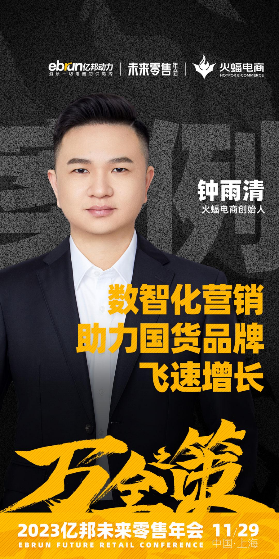 年會期間,火蝠電商CEO鐘雨清先生將親臨現場。以《數智化營銷,助力國貨品牌飛速增長》為命題,拆解頭部國貨品牌增長案例,為觀眾分享全域營銷時代下的數智化營銷戰略玩法,解析國潮消費路徑,找到品牌經營的“萬全之策”,幫助商家實現確定性增長,擁抱新的機會。