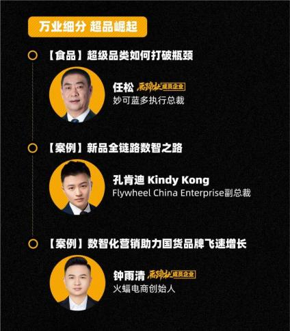 在“萬店連鎖·零售復興”維度,面向零售新時代,如何打破品牌增長瓶頸?紅杉中國合伙人蘇凱將帶來年度思考。同時,a1零食研究所創始人兼CEO周煒平、一知合伙人&首席運營官陳樂、白小T創始人張勇和三只羊集團CEO杜剛等人,則通過零食、AI、服裝、直播等行業賽道分享零售復興之路。